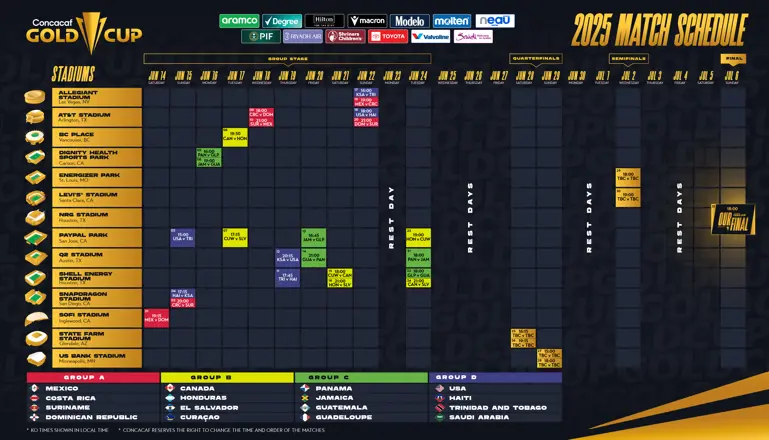 The 2025 Gold Cup will take place from June 14 to July 6 across 14 stadiums in the U.S. and Canada. CONCACAF has published the full schedule, now available in printable formats for media, pressrooms and organizers.