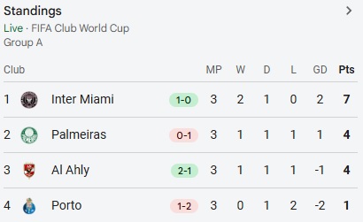 If these scores hold, Inter Miami would secure a place in the round of 16 as Group A leaders. Palmeiras would advance as runners-up over Al Ahly due to the result between them on Matchday 2, when the Brazilians won 2-0. But everything is still subject to change.