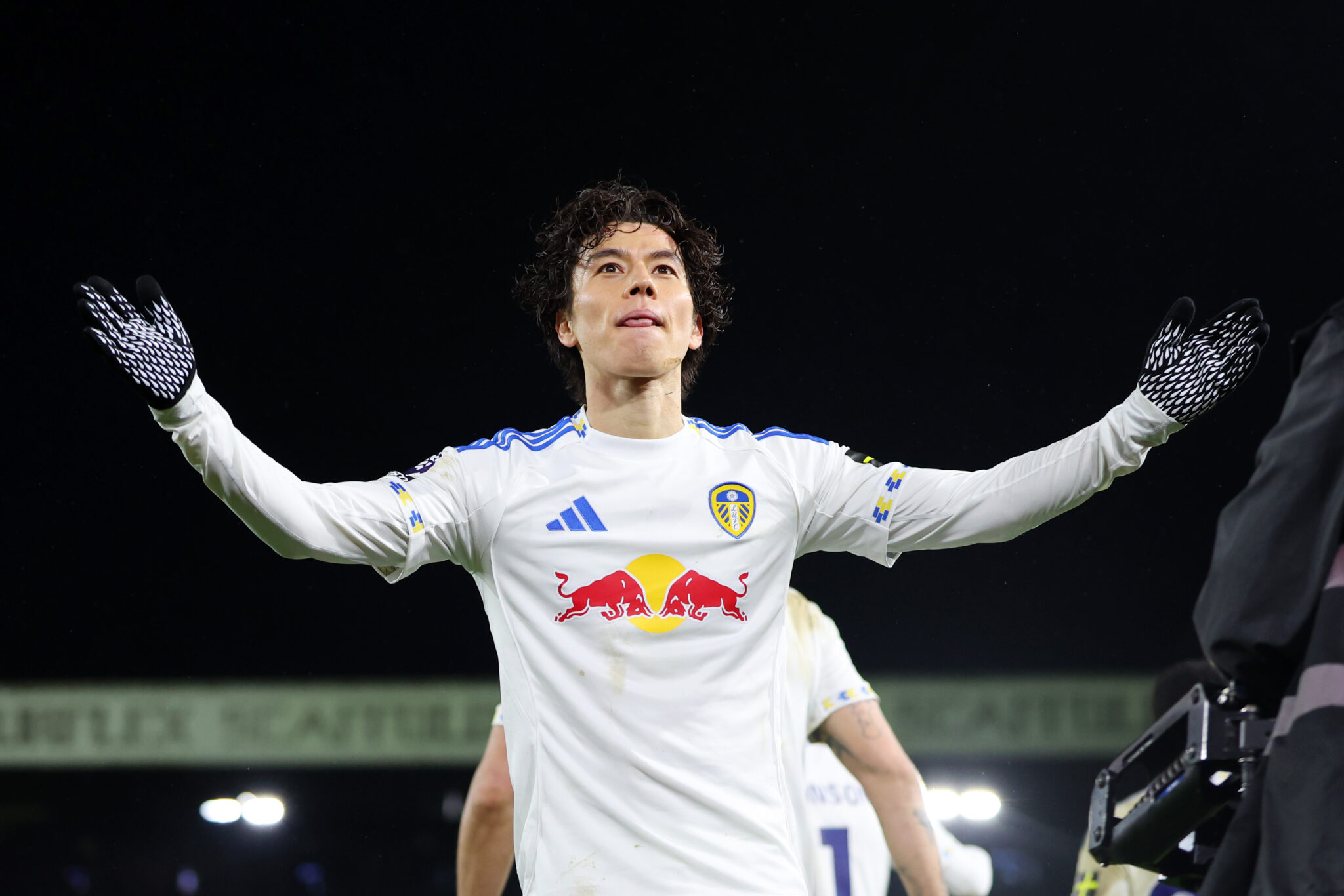LEEDS, ENGLAND - DECEMBER 06: Ao Tanaka of Leeds United celebrates scoring his team's third goal during the Premier League match between Leeds United and Liverpool at Elland Road on December 06, 2025 in Leeds, England. (Photo by Molly Darlington/Getty Images)