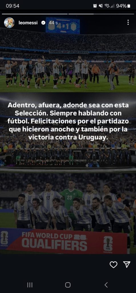 Though sidelined for this international window, Messi closely followed Argentina’s performances. After the emphatic win over Brazil, he took to Instagram to congratulate his teammates: “Inside, outside, wherever it may be with this National Team. Always speaking through soccer”.