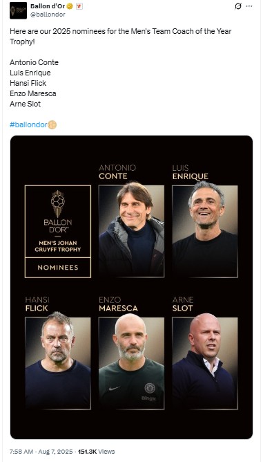 The Ballon d’Or revealed its 2025 Men’s Coach of the Year nominees, with surprising omissions: Pep Guardiola and Lionel Scaloni. Who made the list—and why?