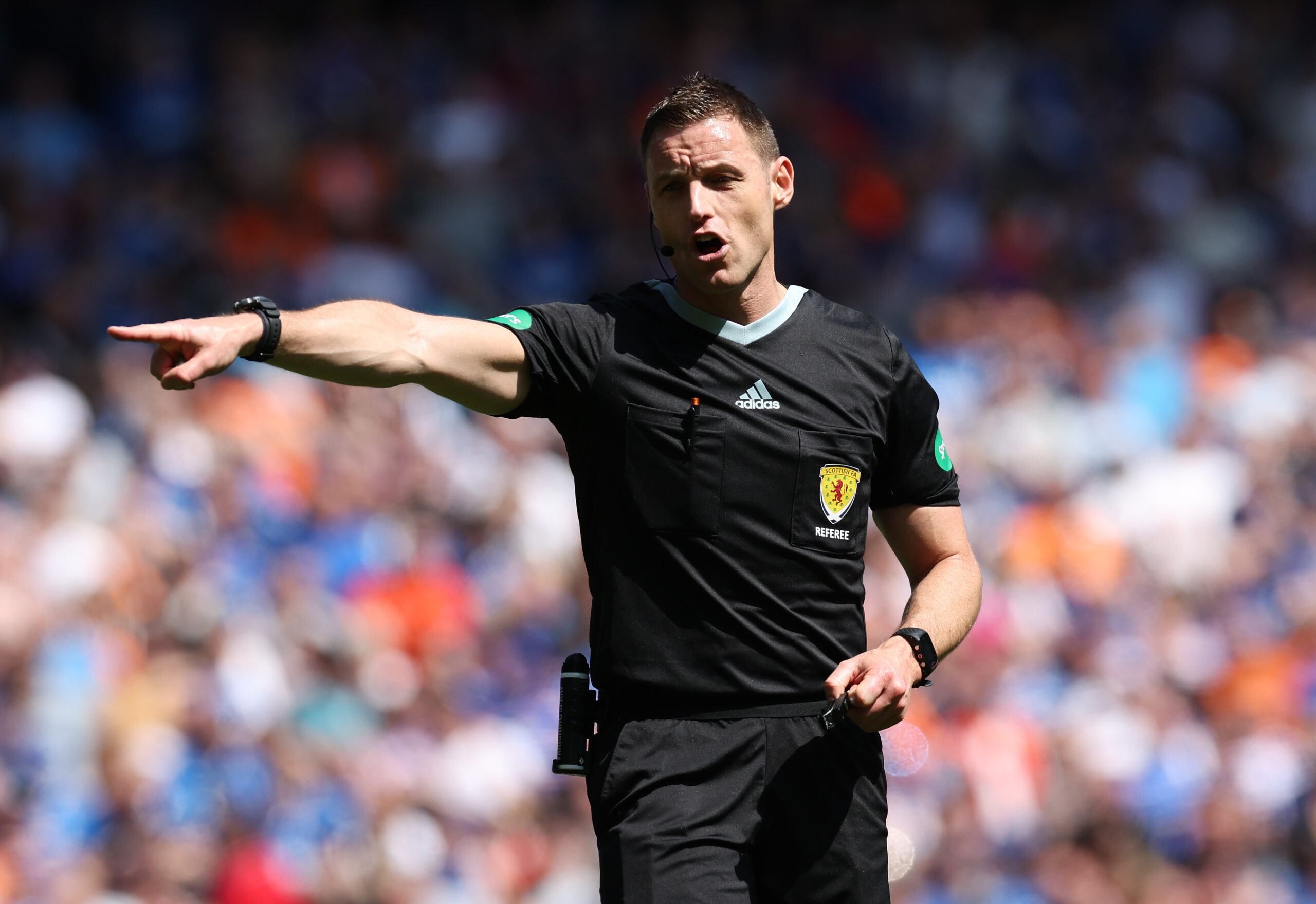 ഗ്ലാസ്‌ഗോ, സ്‌കോട്ട്‌ലൻഡ് – മെയ് 13: 2023 മെയ് 13-ന് ഐബ്രോക്സ് സ്റ്റേഡിയത്തിൽ റേഞ്ചേഴ്സും സെൽറ്റിക്കും തമ്മിലുള്ള സിഞ്ച് പ്രീമിയർഷിപ്പ് മത്സരത്തിനിടെ റഫറി സ്റ്റീവൻ മക്ലീൻ. (ഫോട്ടോ: ഇയാൻ മാക്നികോൾ/ഗെറ്റി ഇമേജസ്)