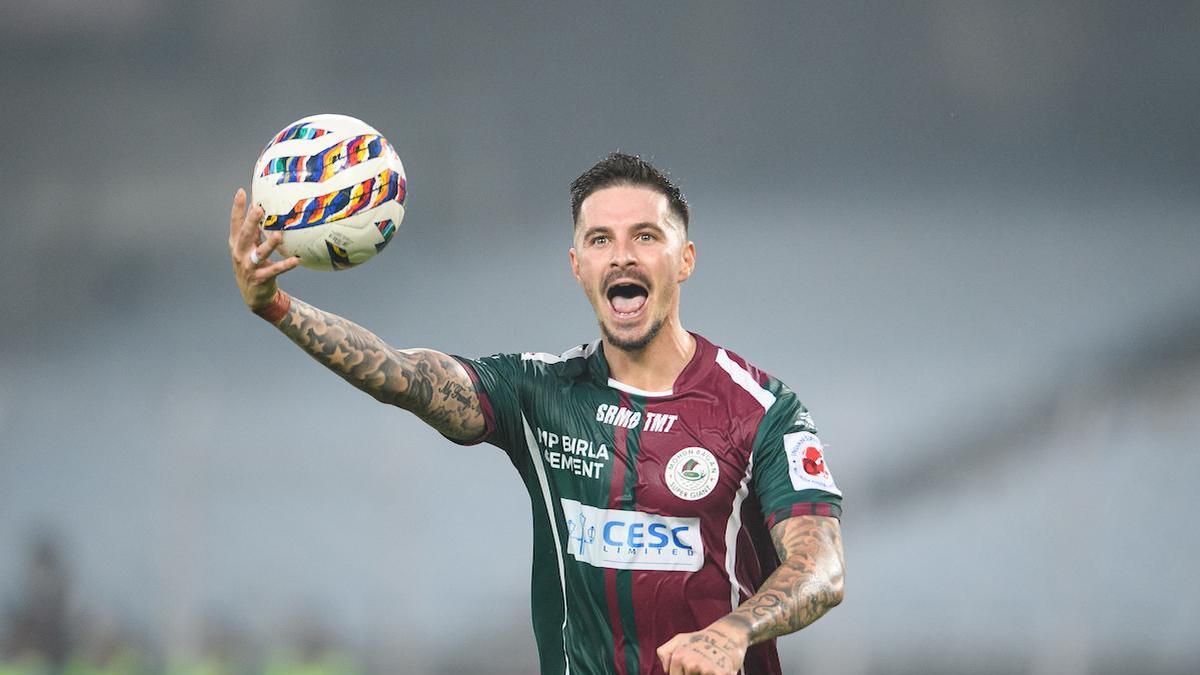 ഒഡീഷ എഫ്‌സിക്കെതിരായ മത്സരത്തിൽ മോഹൻ ബഗാൻ സൂപ്പർ ജയന്റ് താരം ജാമി മക്ലാരൻ ഹാട്രിക് നേടിയ ശേഷം ആഘോഷിക്കുന്നു. | ഫോട്ടോ ക്രെഡിറ്റ്: ISL മീഡിയ